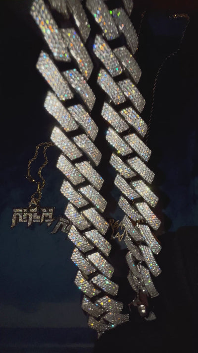 La Cadena Cubana Prong 25mm es la definición de poder y lujo en la joyería urbana. Con un grosor imponente de 25mm, cada eslabón está meticulosamente engastado con piedras que ofrecen un brillo deslumbrante y una presencia inconfundible.