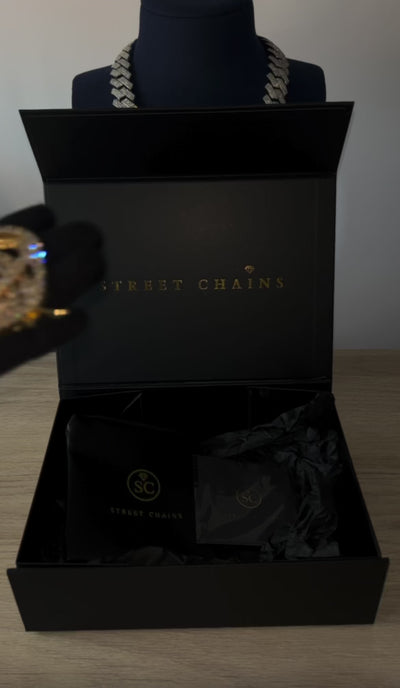 Usamos plata 925, acero inoxidable premium y chapados en oro de 24K en múltiples capas para asegurar durabilidad y lujo real. No es solo joyería urbana, es una obra de arte Iced Out pensada para durar y destacar.